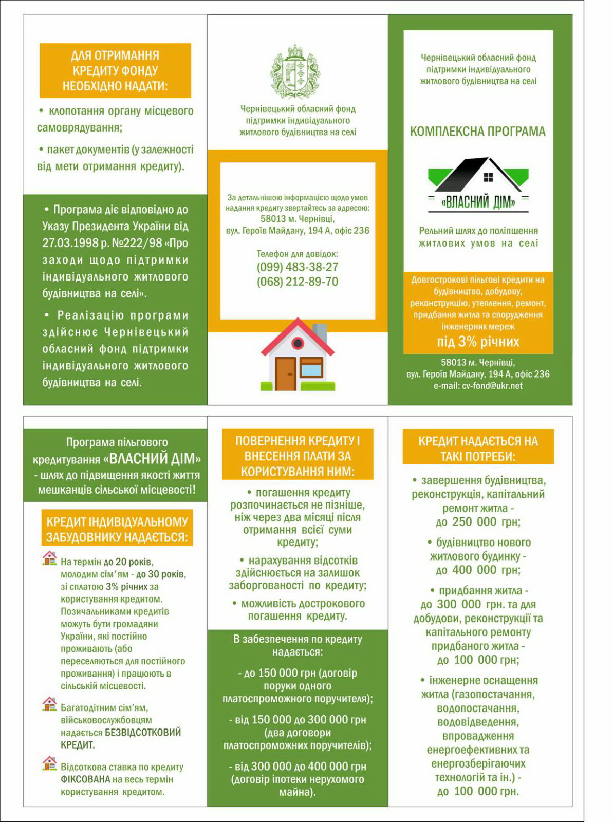 На Буковині продовжено реалізацію державної пільгової програми „Власний дім”, згідно якої Чернівецький обласний фонд підтримки індивідуального житлового будівництва на селі надає пільгові кредити на: