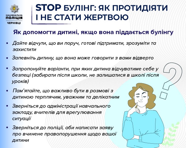 Співробітники поліції дають важливі поради на випадок, якщо дитина піддається булінгу чи насильству. Запам’ятайте: дітям важлива ваша підтримка, допомога і турбота, тому поясніть їй, що ви поруч і вам можна про все розповісти.