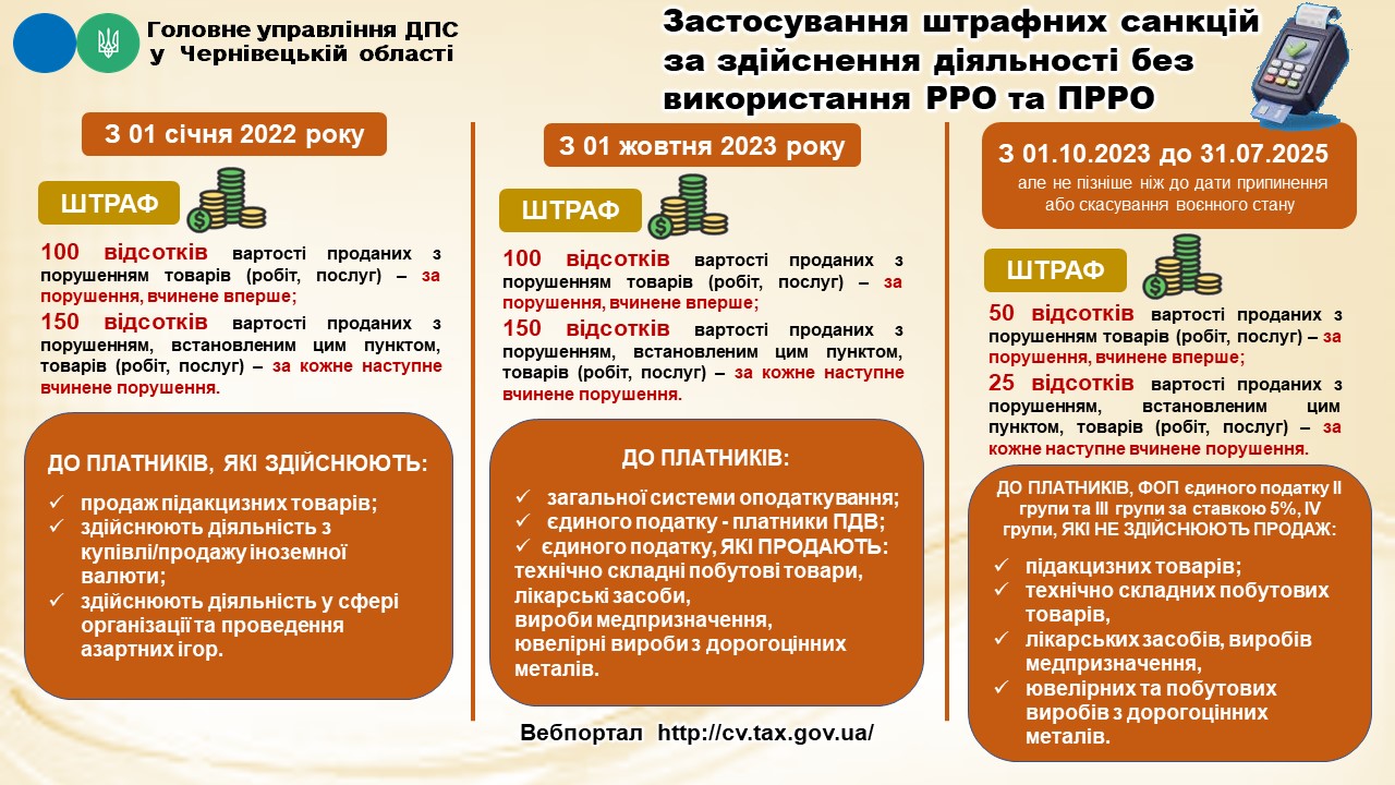 Слід звернути увагу, що у період з 1 серпня 2023 року по 31 липня 2025 року, але не пізніше ніж до дати припинення або скасування воєнного стану на території України, до фізичних осіб – підприємців, які є платниками єдиного податку та не зареєстровані платниками податку на додану вартість, що здійснюють діяльність з продажу товарів (крім підакцизних товарів, технічно складних побутових товарів, що підлягають гарантійному ремонту, лікарських засобів, виробів медичного призначення, ювелірних та побутових виробів з дорогоцінних металів, дорогоцінного каміння, дорогоцінного каміння органогенного утворення та напівдорогоцінного каміння) або надають послуги, фінансова відповідальність за проведення розрахункових операцій з використанням реєстраторів розрахункових операцій, програмних реєстраторів розрахункових операцій або розрахункових книжок на неповну суму вартості проданих товарів (наданих послуг), непроведення розрахункових операцій через реєстратори розрахункових операцій та/або програмні реєстратори розрахункових операцій з фіскальним режимом роботи, невидачу (у паперовій та/або електронній формі) відповідного розрахункового документа, що підтверджує виконання розрахункової операції, або проведення її без використання розрахункової книжки на окремому господарському об’єкті такого суб’єкта господарювання застосовується у таких розмірах: 25 відсотків вартості проданих з порушенням, встановленим цим пунктом, товарів (робіт, послуг) – за порушення, вчинене вперше, 50 відсотків вартості проданих з порушенням, встановленим цим пунктом, товарів (робіт, послуг) – за кожне наступне вчинене порушення.