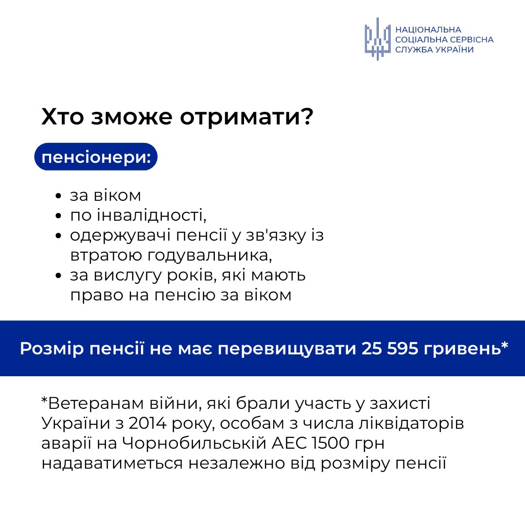 Виплата у розмірі 1 500 гривень надійде автоматично через звичні канали отримання пенсій або соціальних виплат – на банківські рахунки або через відділення Укрпошти. Одержувачам не потрібно додатково подавати заяви.