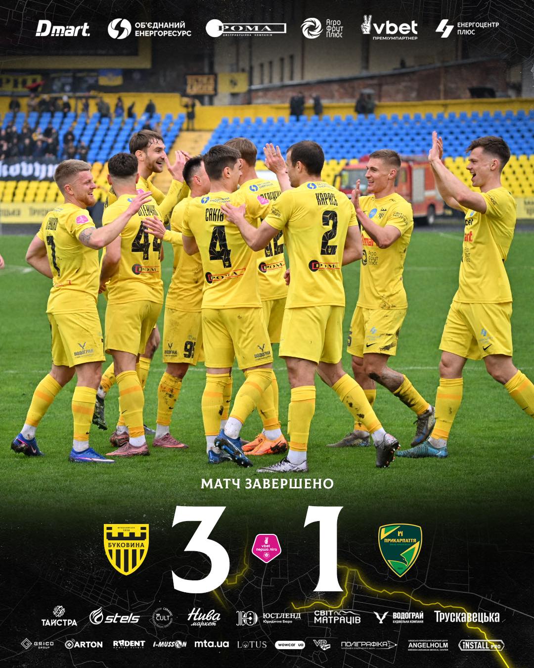На 81-й хвилині капітан «Буковини» Петро Стасюк пробив другий гол. І одразу через три хвилини третій – забив півзахисник «жовто-чорних» Родіон Плакса.